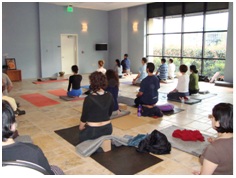 b. Breath Awareness – Next, sitting in a comfortable posture, students bring their awareness to the breath. Just watching the breath anchors the mind deeply within. The frequency of thoughts reduces dramatically and it becomes easy to set the intention for the session.