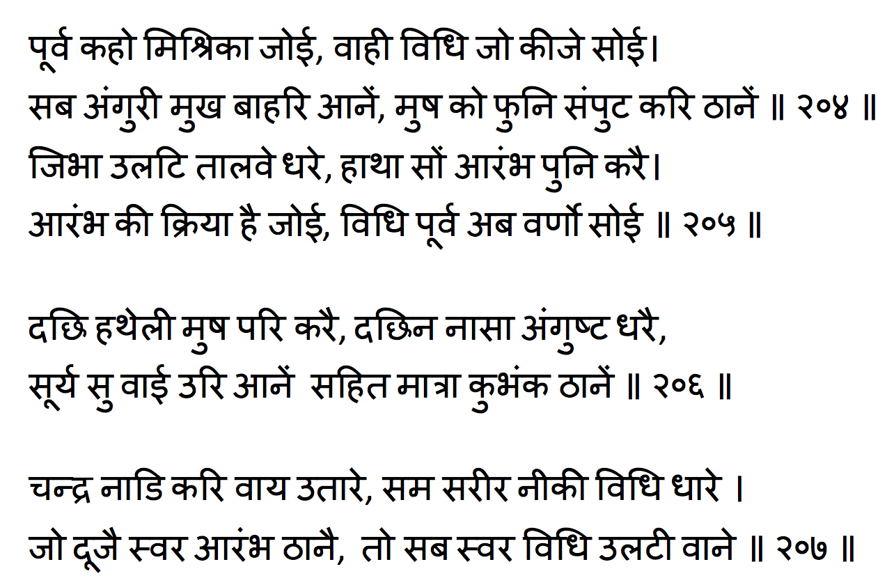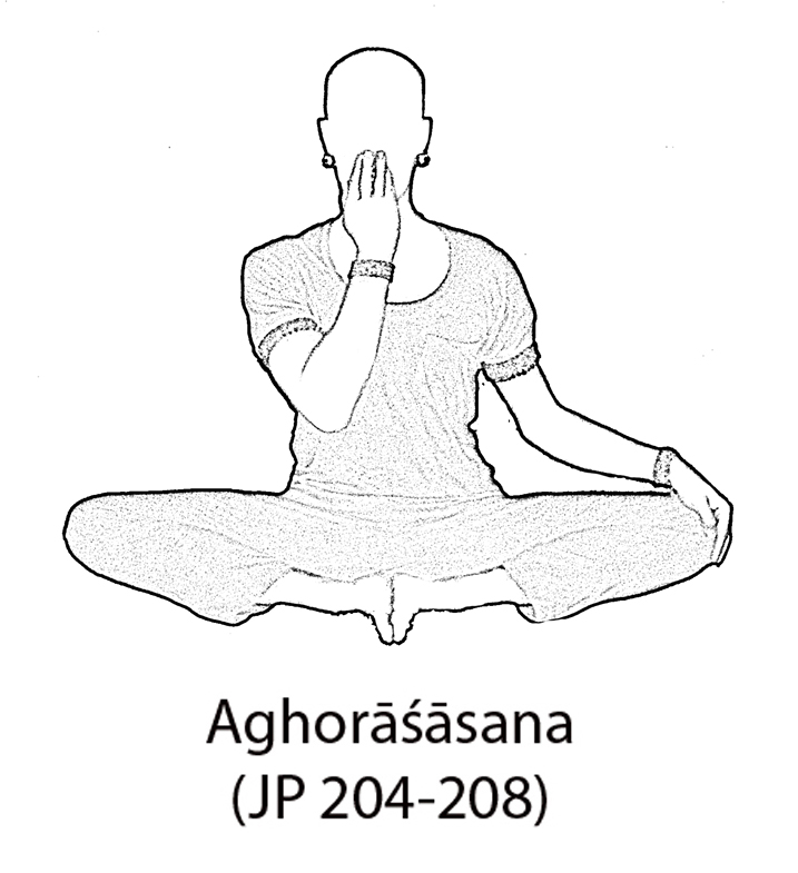Translation: This Aghora asana should be practiced in the manner of Misraka asana. Take all of the fingers away from the mouth and make a hollow like mouth. Turn the tongue and place it on the palate. Put right hand on the face and place the thumb towards the right nostril. Then inhale through the right nostril and after kumbhaka exhale through the left nostril. Then inhale though the right nostril and after kumbhaka, exhale through the left nostril. While inhaling again, inhale through the left and proceed in reverse order.