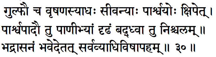 Translation : One should place the two ankles under the scrotum adjacently to the perineum and hold the feet firmly with hands and remain steady.