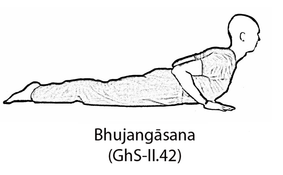 Translation: Let the body, from navel downwards to the toes, touch the ground place the palms on the ground, raise the head (the upper portion of the body) like a serpent. This is called the serpent posture.