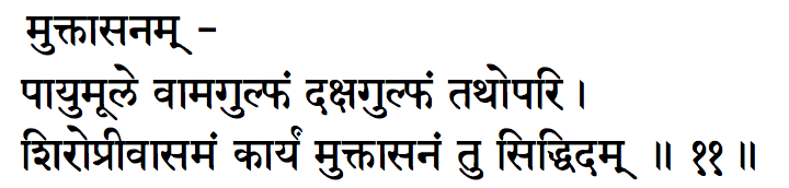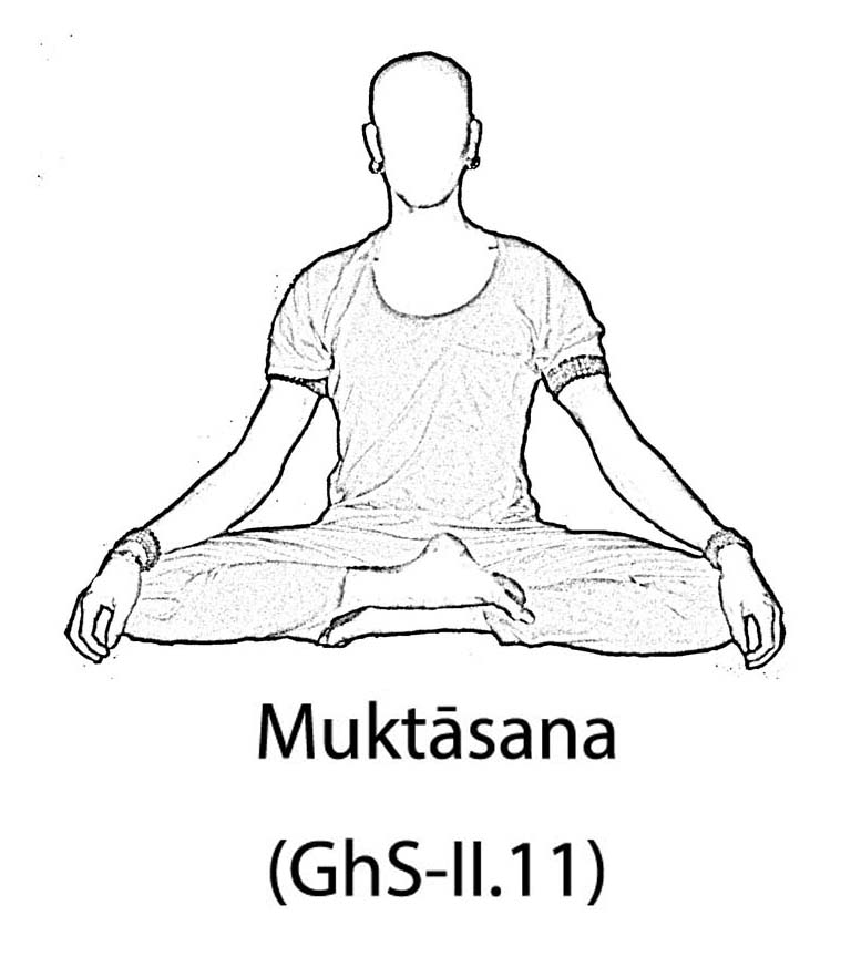 Translation: Place the left heel at the root of the organ of generation and the right heel above that.  Sit straight, keep head and neck in line with the body. This posture is called the muktasana.