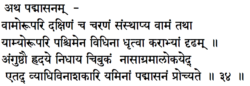 Translation: Place the right foot on left thigh. Now place the left foot on the right thigh. Cross the hands behind the back and firmly catch hold of the great toes of the feet so crossed. Place the chin on the chest and fix the gaze on the tip of the nose (this posture is called the Padmasana (or lotus posture). This posture alleviates diseases of yogis.