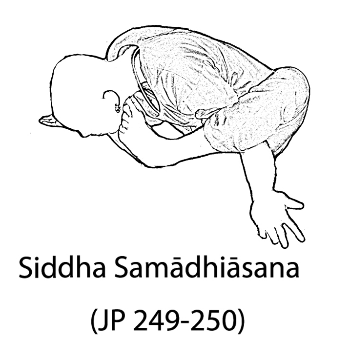 Translation: Bring both the soles together and place them in front of generative organ by keeping a distance of eight fingers between the heels. Put the hands in between legs and place the elows and wrist on the ground by bending forward towards the ground. Place the nose on the ground while toes touches the throat.