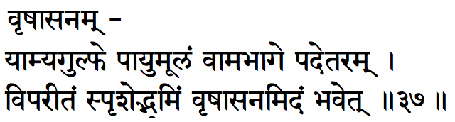 (GhS-II.36-37), (BrYs-III.45) Slokha: Translation: Place right ankle on anus and upturned left foot on left of it, touching the ground. Benefits: Strengthens the abdominals and back Opens and Stretches the hip muscles, low back and knees